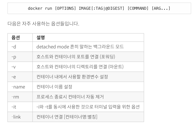 docker run [option] IMAGE[:TAG|@DIGEST] [COMMAND] [ARGS...] : 컨테이너 실행