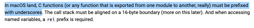 I can find a Linux 64-bit system call table, but the call numbers do not work on macOS - I get a Bus Error: 10 whenever I try to use them. What are the macOS call numbers for operations like sys_w...