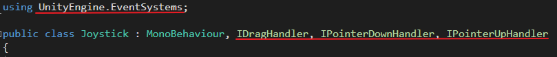 조이스틱은 Drag, PointerUp, PointerDown 때 활용되므로 인터페이스를 상속받아 사용함
